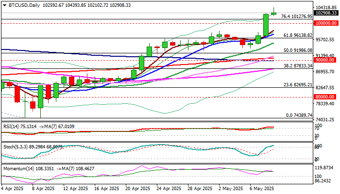 Near-term sentiment was brightened by announcement of US-UK trade agreement and expected talks between US and China over the weekend, which may further boost bullish stance and continue to lift coin’s price.