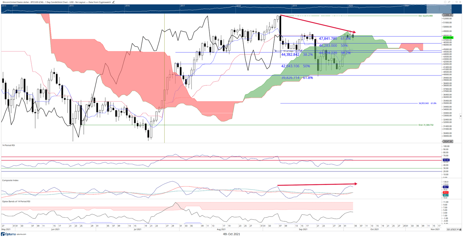 Bitcoin price, despite the intense buying pressure, remains inside the Cloud. Since returning inside the Cloud on September 20th, the price action has been another example of the frustration and volatility and instrument faces inside the Cloud. Sellers appeared in overwhelming control until facing buying support at $40,000; the buyers now feel that same control.