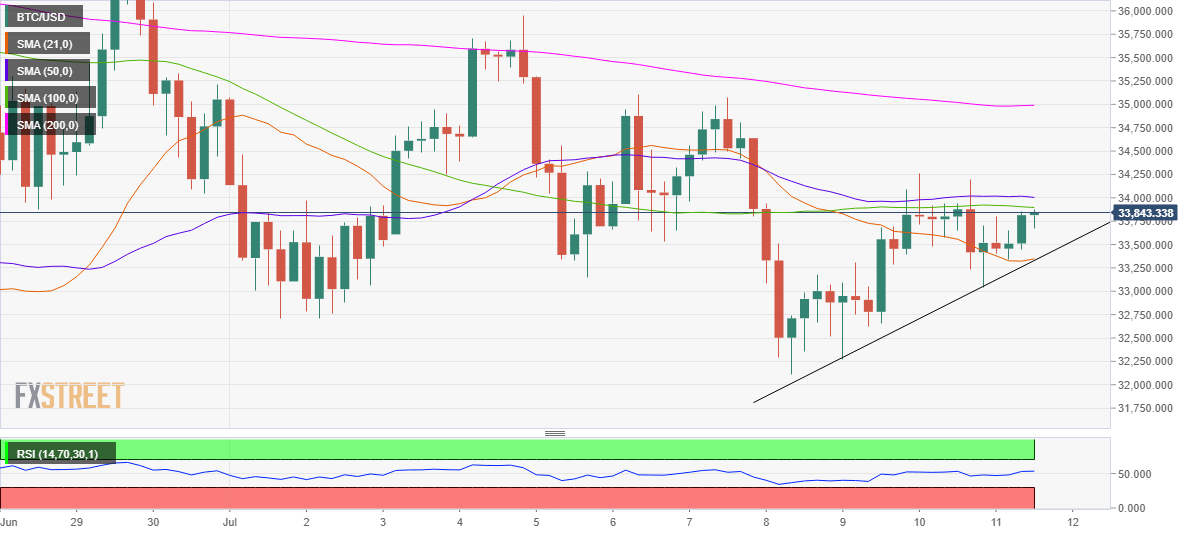 Bitcoin is reversing the previous losses on Sunday, as the bulls look to resume the recent recovery momentum from two-week lows of $32,114 reached on July 8.