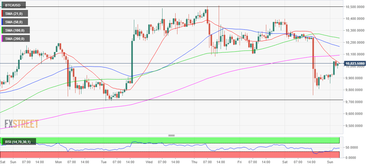 From a technical perspective, the corrective slide in the No. 1 coin accelerated only after the 21-hourly Simple Moving Average (SMA), now at 10,035, pierced both 50 and 100-HMAs from above. The spot saw a fresh leg lower and subsequently reached a new four-day low at 9,755.78 after the bulls caved into the 200-HMA support near 10,080. At the same time, the hourly Relative Strength Index (RSI) extended its south-run and entered the oversold territory.