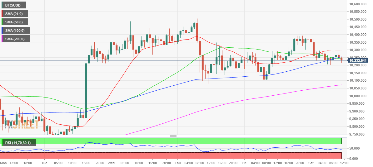 As observed in the hourly chart, the price wavers in a narrow range between 10,300-10,200 so far this Saturday, having witnessed a 180-pips steep drop in the overnight trades. Since then the price has kept its range below the 21-hourly Simple Moving Average (SMA), now at 10,293 levels. Only a sustained break above the latter would revive the bulls in the near-term, paving the way towards the multi-month tops.