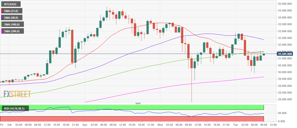 As observed in the hourly chart, the Bitcoin buyers are trying hard to recapture the critical barrier around $31,480, which is the confluence of the horizontal 21 and 100-hourly moving average (HMA).