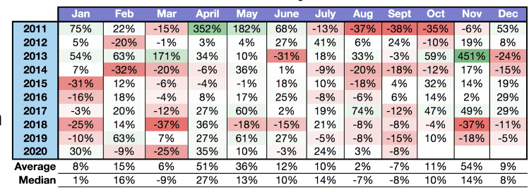 If the past is any indication of the future, one should brace for Oct. to outperform September, just as it has for 8 of the past nine years, and return around +11%. Do note that relative to the average monthly return, bitcoin has underperformed 6 of the past nine months.