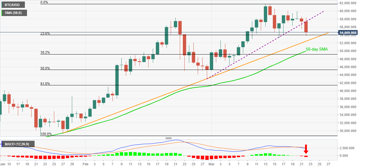 Bitcoin bears catch a breather around $54,850 following a heavy downfall to $53,756 on late Monday. In doing so, the crypto major portrays a corrective pullback after declining to the lowest in one week on the key support line breakdown.