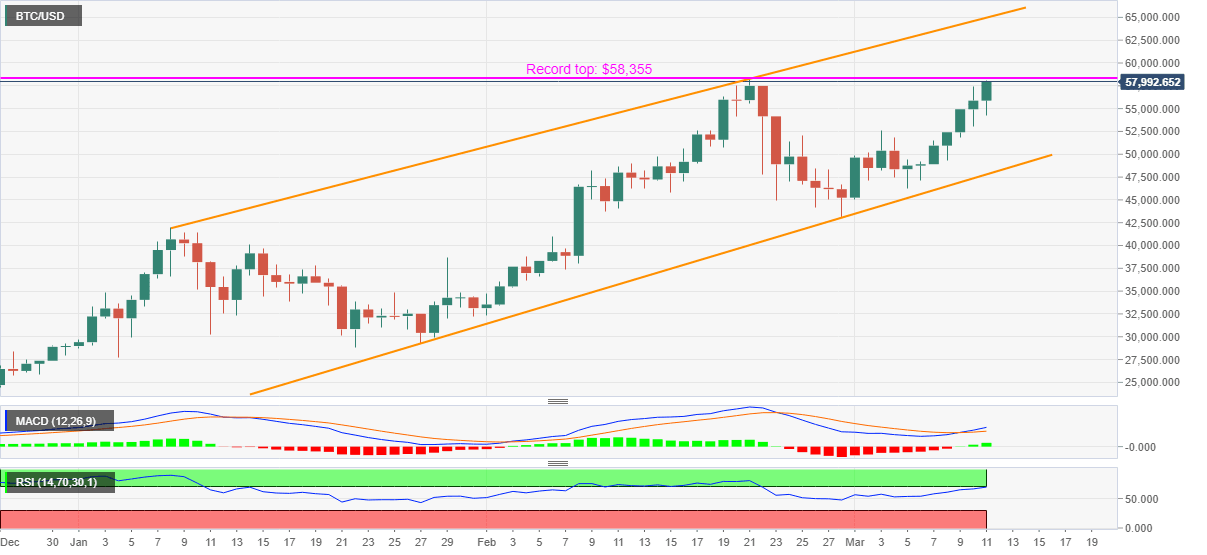 Bitcoin bulls are hammering the record top marked in February while taking the bids near $58,000 during early Friday. The crypto major gains support from upbeat MACD inside a bullish chart pattern to cross the previous all-time high of $58,355.