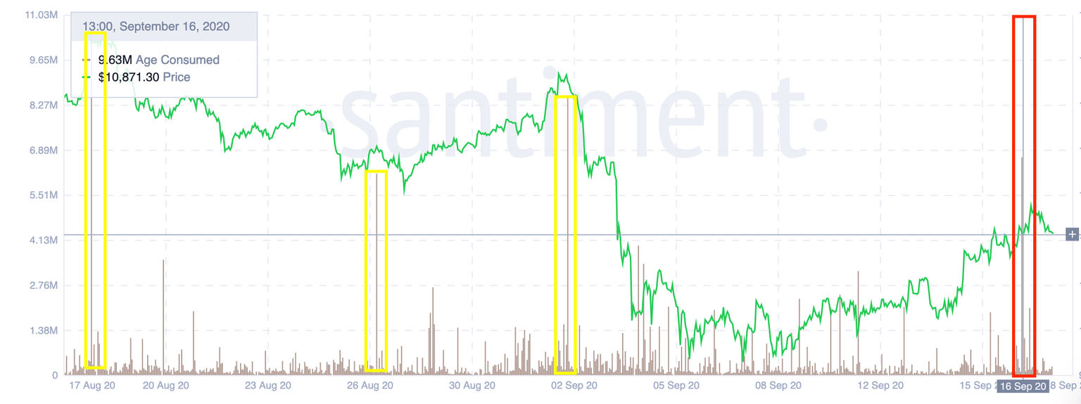 The on-chain data sends alarming signals. Age consumed indicator used to predict the periods of sharp volatility has had the sharpest spike in a month, signaling that BTC may be ready to ride a roller-coaster. As shown in the graph below, the three previous spikes of the indicator led to increased market volatility in the direction opposite to the prevailing market movement.