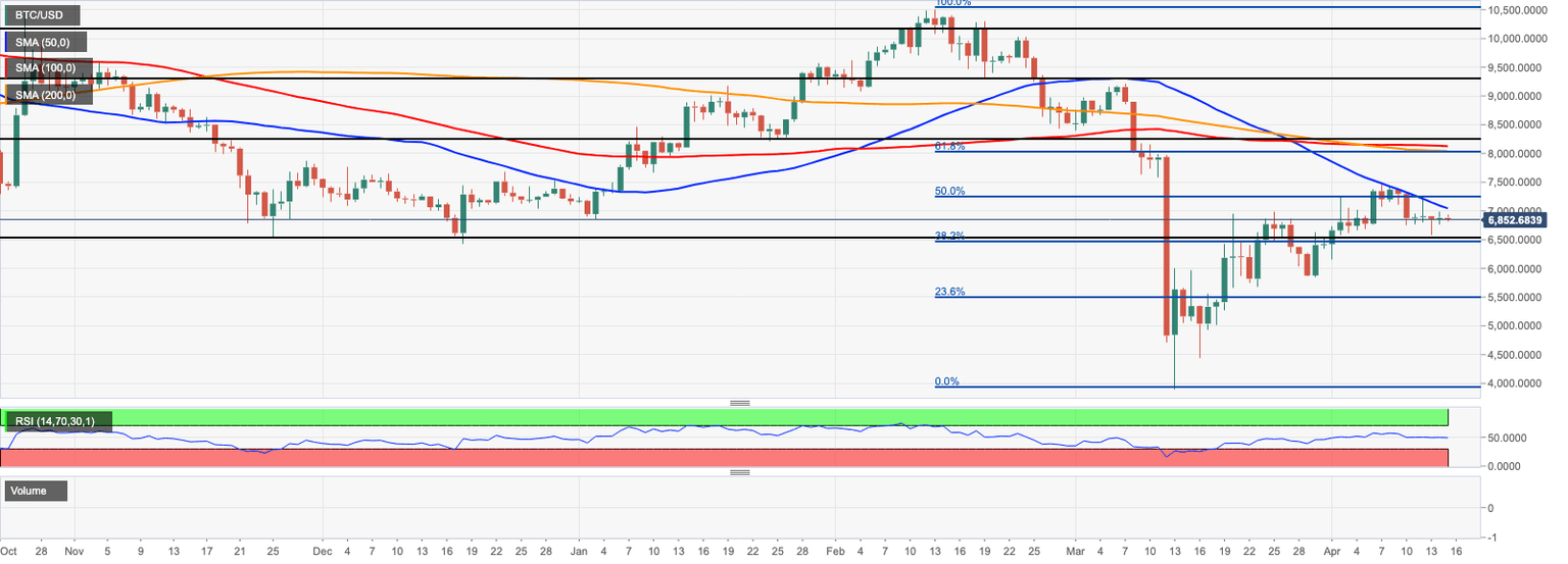 On the downside, the strong support is created by $6,600-$6,500 area, which includes April 13 low. It is also reinforced by 38.2% Fibo retracement for the above-said move. If it is cleared, the sell-off may be extended towards $6,000. The critical support comes at $5,650, which is a confluence of weekly SMA200 and 23.6% Fibo retracement.