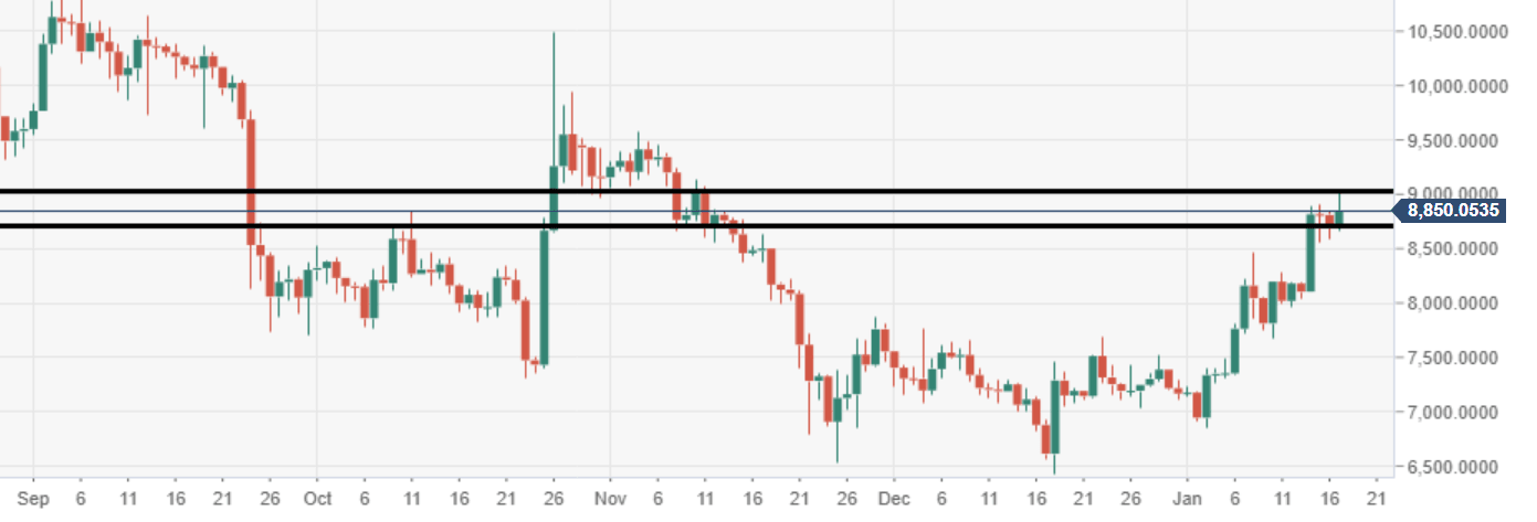 - The bulls are edging closer towards a break into the $9000 price territory.