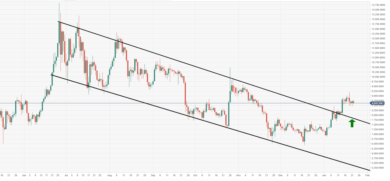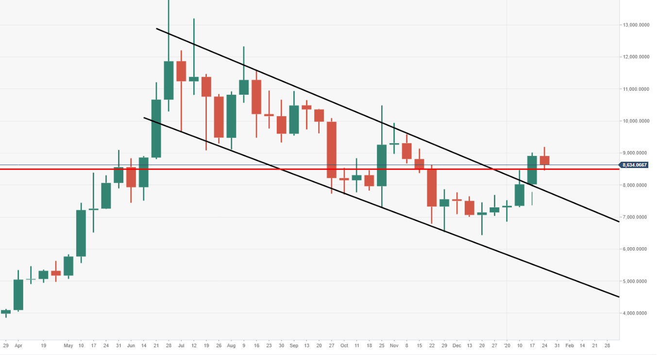 - BTC/USD continues to consolidate underneath $9000 barrier and on top of critical support $8500.