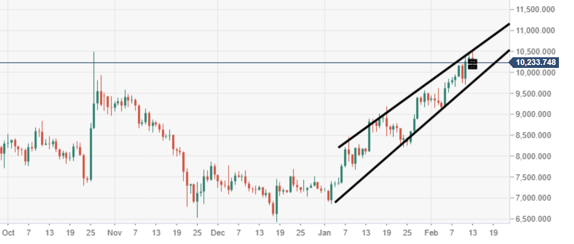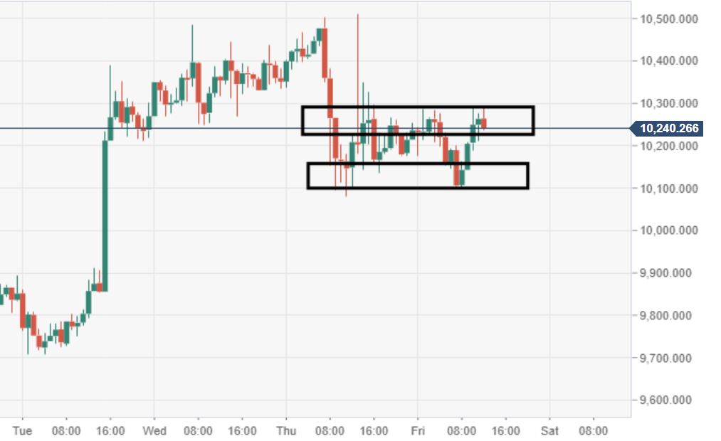 The price has been sucked back within a narrowing range via the 60-minute chart, the high at $10,300 down to $10,100.