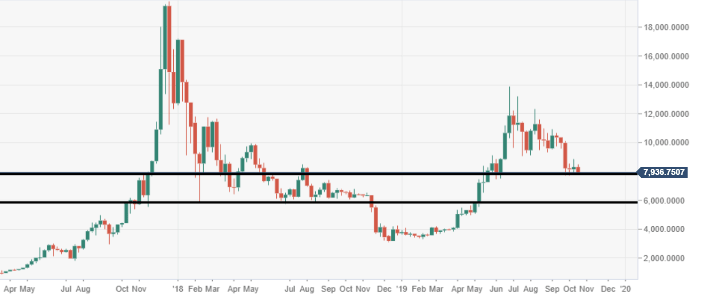 BTC/USD is flirting with big weekly support seen at $7800, the price has touched this for going on four weeks now. Bitcoin has not traded below this via the weekly since May when the price was moving north at the time.
