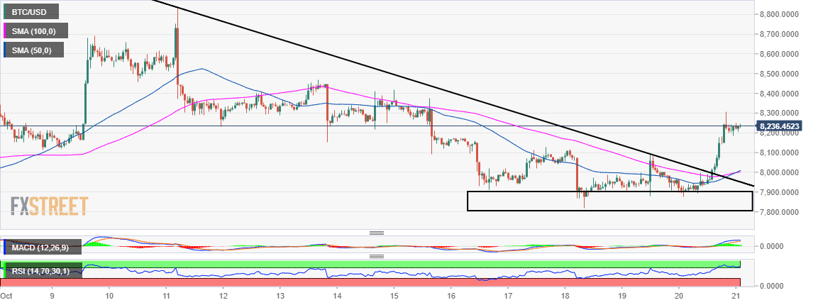 Meanwhile, the brief recovery quickly catapulted Bitcoin above the resistance at $8,300. The leg extended to $8,300 before adjusting to the current market value of $8,240. Currently, BTC is trading above the 50 Simple Moving Average (SMA) on the one-hour chart and the 100 SMA. With the short-term 50 SMA crossing above the 100 SMA, it means that buyers are gaining momentum.