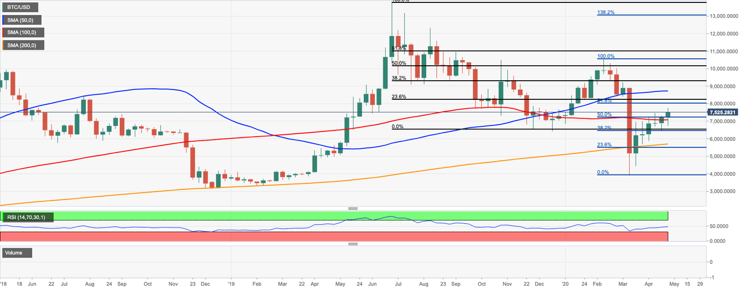 While the long-term picture looks inspiring, BTC may enter a consolidation phase in a range limited by $7,000 on the downside and $8,000 on the upside. the upper boundary of the range is reinforced by 61.7% Fibo retracement for the downside move from February 2020 high and closely followed by 23.6% Fibo retracements for the downside move from July 2019 high to December 2019 low.
