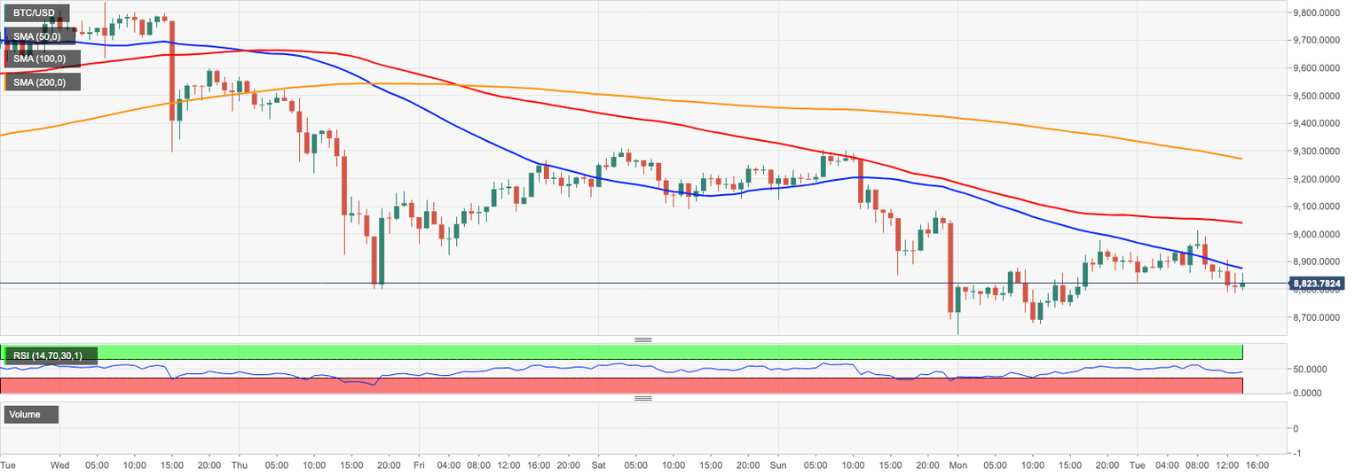 BTC/USD is changing hands at $8,820 as bullish attempts stop short of the local resistance created by the sloping 1-hour SMA50. The bulls forced this barrier during early Asian hours, but failed to hold the ground and retreated to the previous range. BTC has stayed mostly unchanged both on a day-to-day basis and since the beginning of Tuesday and the market struggles to figure out where to go next.