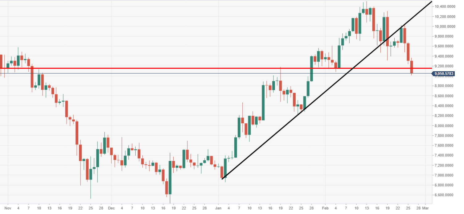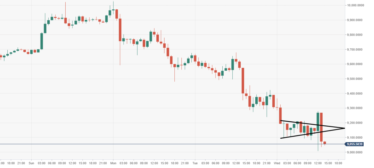 Daily support should be noted at $9100, failure to hold could invite a fresh wave of selling pressure.
