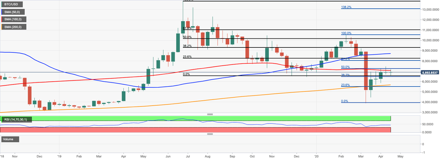 At the time of writing, BTC/USD is hovering around $6,800 mostly unchanged since the beginning of the day. The first digital coin recovered from Monday's low $6,570, but the upside momentum remains too weak to take BTC/USD above the psychological $7,000. This resistance is reinforced by weekly SMA100 and daily SMA50. This technical barrier has been limiting Bitcoin's upside since the beginning of April. Once it is out of the way, the upside is likely to gain traction with the next focus on $7,150 (50% Fibo retracements for the recent downside move from February 2020 high), and the highest level of the previous week $7,468.