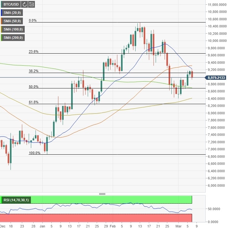 With this recent fall, the RSI indicator on the daily chart turned south below the 50 handle to suggest that the bearish momentum is building up. The next critical support for the pair aligns at $8,700 (200-day SMA/Fibonacci 50% retracement of January-mid-February rally) before $8,400 (March 1 low/100-day SMA).