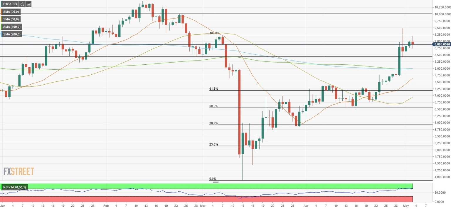A strong resistance seems to have formed at the $9,200-9,250 area, where the sharp fall witnessed earlier in March started. Only a daily close above that level could open the door for the extension of the uptrend toward $9,480 (Apr. 30 high) and $10,000 (psychological level).