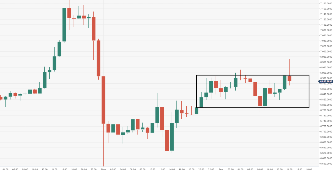 Vulnerabilities remain tilted to the downside given the price is trading under $7000.