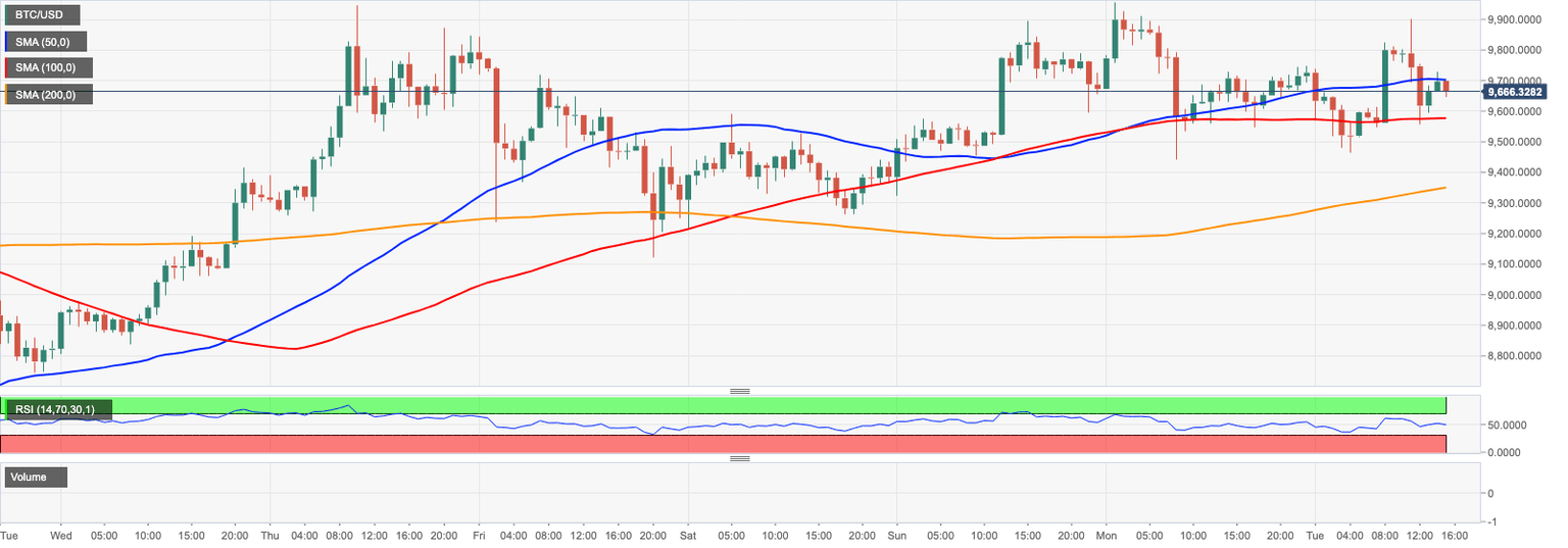 Bitcoin (BTC) has been locked in a tight range between $9,800 and $9,400 since Monday. At the time of writing, BTC/USD is changing hands below $9,700, mostly unchanged both on a day-to-day basis and since the beginning of Tuesday. On the intraday charts, BTC is supported by 1-hour SMA100 (currently at $9,600), while the resistance is created by 1-hour SMA50 on approach to $9,800. The ultimate bullish target is created by a psychological $10,000.
