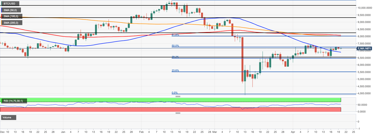 On the downside, the support is created psychological $7,000, followed by the daily SMA50 (currently at $6,880). This line limited the recovery since the beginning of April, now it serves as strong technical support. If bulls fail to maintain the price above this barrier, the sell-off may be extended to support area $6,500-$6,400, which includes the lowest levels of the previous two days and 38.2% Fibo retracement for the above-said movement.