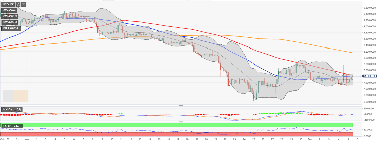On the 4-hour chart, SMA50 (Simple Moving Average) and SMA100 clustered around $7,430, may limit the further upside. However, one this barrier is out of the way; the bullish momentum may gain traction with the next focus on Wednesday's high of $7,770. This area may attract short-term buyers and trigger another sell-off inside the previous range, though ha sustainable move higher will open up the way towards psychological $8,000.