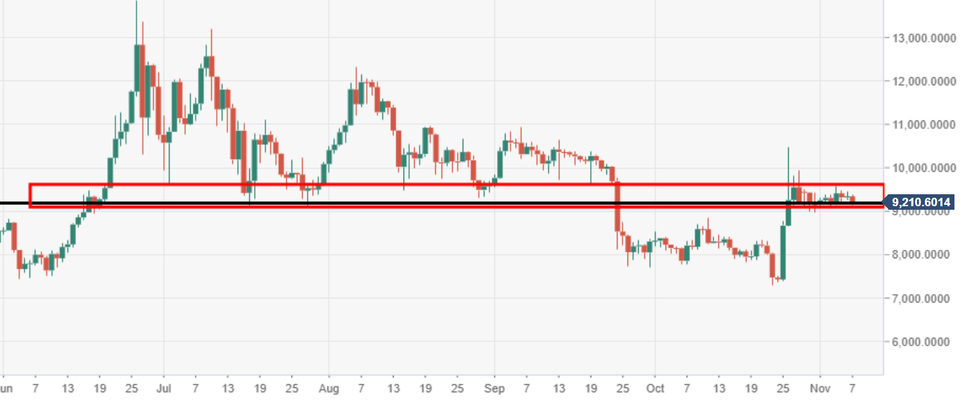 Given the lack of momentum to at present move through this territory, it makes the price more vulnerable to further downside risks. Failure to break above could force BTC to reverse the late October bull run, where it gained some 40%. Support for now can be seen holding at $9200, critical daily level.