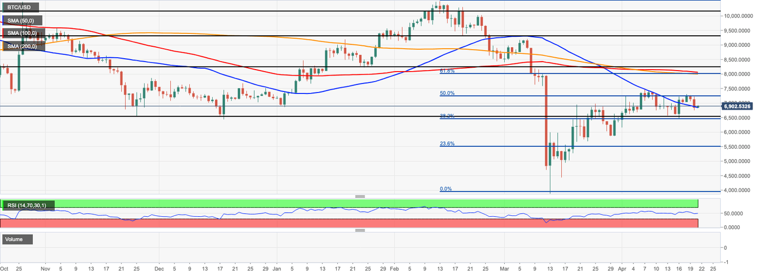 On the upside, a sustainable move above $7,000 is needed for the upside to gain traction. The psychological barrier is reinforced by weekly SMA100; however, once it is cleared, the upside may be extended towards the next resistance created by 38.2% Fibo retracement for the downside move from February 2020 high at $7,150.