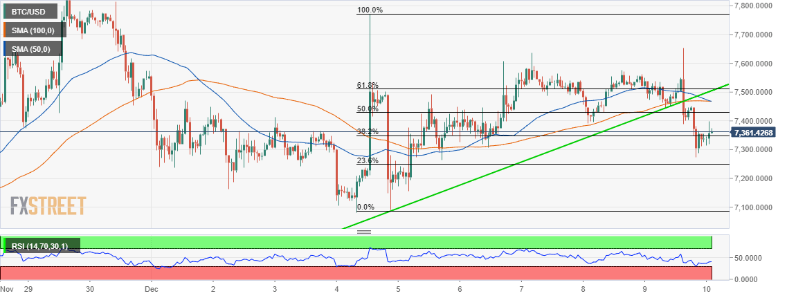 The price dived beneath the range support at $7,400 following the retreat from the weekend high around $7,637. Various tentative support zones failed to rise to the occasion including the 50 SMA, the 100 SMA on the 1-hour chart and the ascending trendline support.