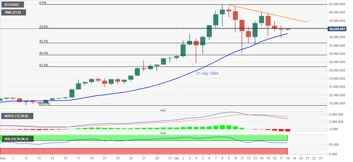 BTC/USD bounces off intraday low of $35,576 to tease the $36,000 threshold, currently around $35,860, during early Monday. The crypto major dropped to the lowest since January 13 the previous day but failed to provide a daily closing below 21-day SMA.