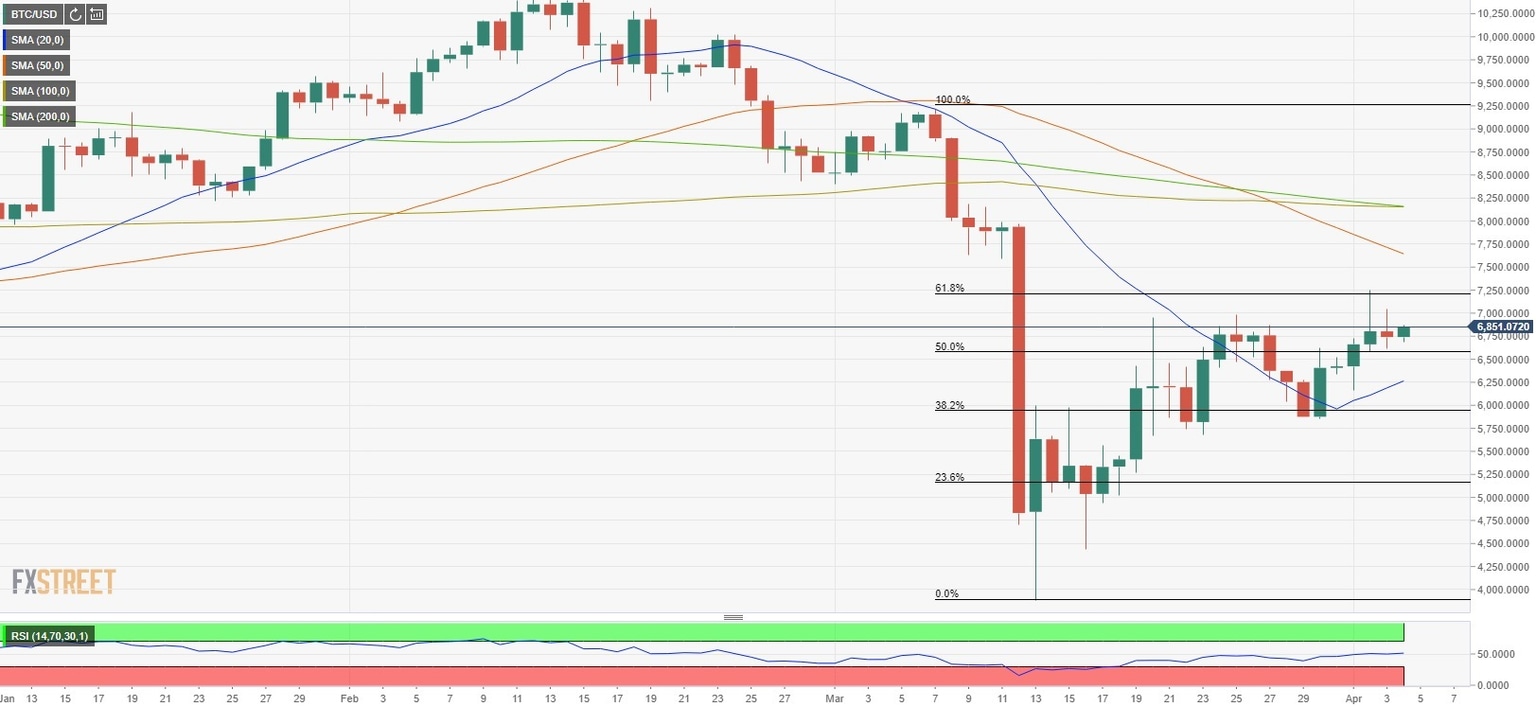 Thursday's rally lifted the price to the Fibonacci 61.8% retracement of the sharp drop witnessed during mid-March at $7,250. However, the daily candlestick, which has a long wick and a small body, shows that the selling pressure remains strong around that area. With a daily close above $7,250, the pair could target $7,650 (50-day SMA) ahead of $8,170 (100-day SMA/200-day SMA).