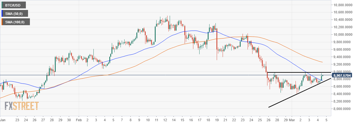 - BTC/USD rising triangle hints that a reversal towards $8,600 and $8,400 is around the corner especially id $10,000 remains at bay.