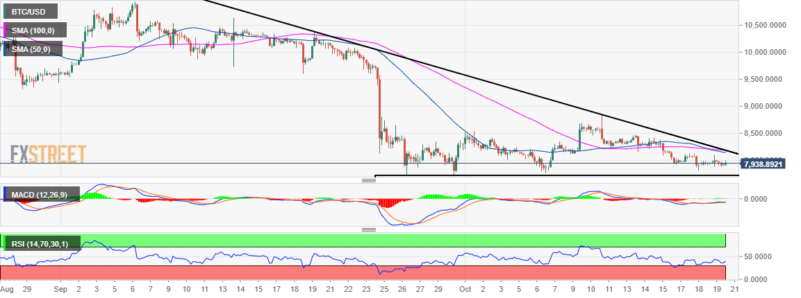 Consequently, as long as the 50 Simple Moving Average (SMA) on the four-hour chart stays below the 100 SMA, Bitcoin will continue to suffer under the tight grip of the bears. Also limiting movement is the long-term descending triangle resistance. On the downside, $7,800 is a viable support area but further declines are likely to find support at $7,700 (previous support).