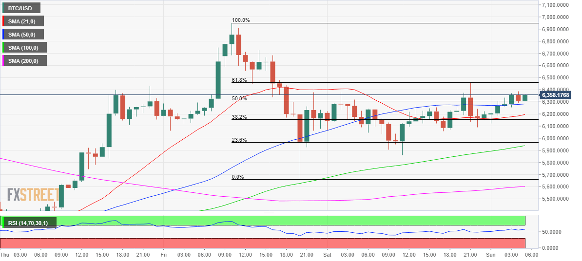 Technically, as observed on the hourly chart, the coin has risen back above all major Simple Moving Averages (HMA), with the immediate upside capped around 6450 region, the 61.8% Fibonacci Retracement level of Friday’s decline (from 6951.22 to 5666.65) and Saturday’s high. A sustained break above the aforementioned resistance will offer a fresh boost to the BTC bulls, as the recovery will regain traction towards a retest of the 7k mark. The hourly Relative Strength Index (RSI) is back above the midline and inches higher, still well below the overbought territory that points to the further upside in store.