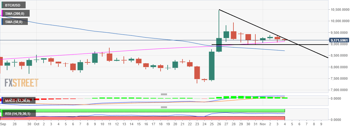 For now, the price is teetering at $9,182 whereby the immediate upside is limited by the descending trendline resistance. At the same time, the immediate downside is protected by the 200-day Simple Moving Average.