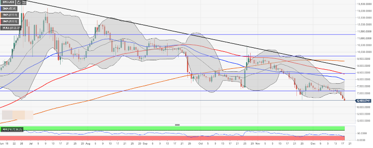BTC/USD broke below $6,800 that served as local support and extended the decline towards the next barrier created by November low on approach to $6,500. The following support comes at $6,300 (the lower line of the weekly Bollinger Band) and $6,000.