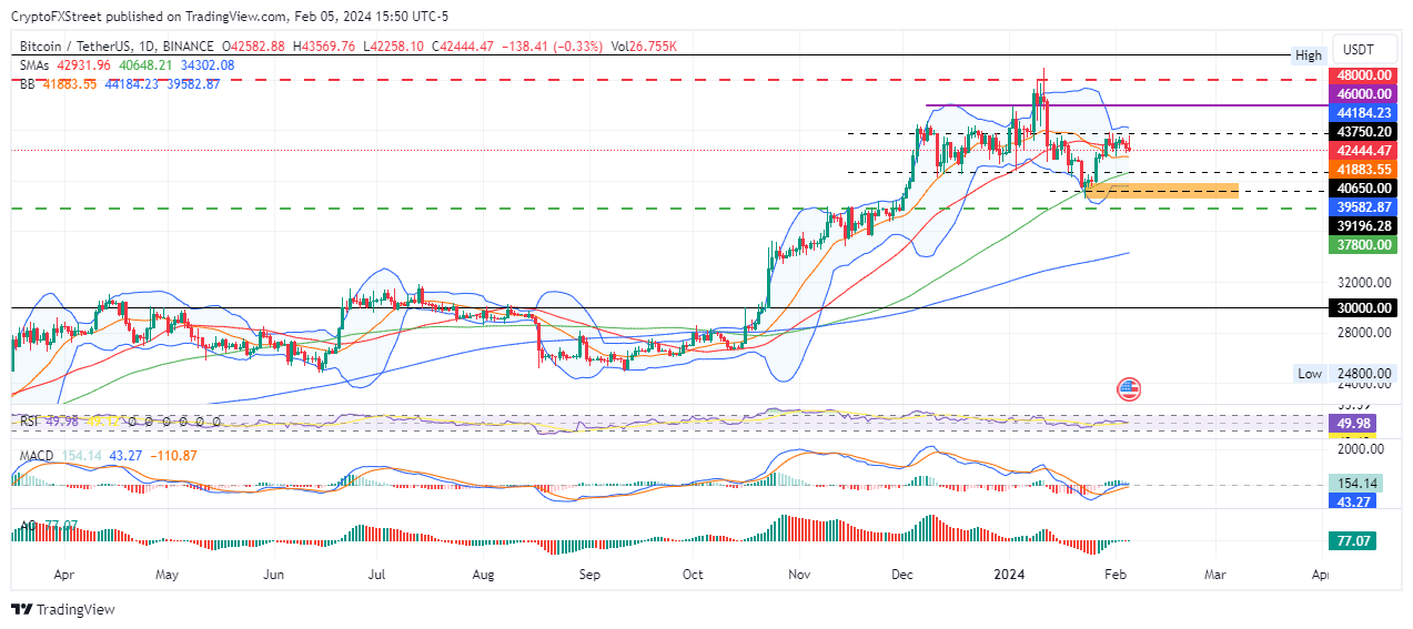 Bitcoin price remains range-bound, consolidating between the centerline and the upper band of the Bollinger indicator at $41,882 and $44,182. The two levels appear to be coming together, a move that often precipitates an impulsive or rash move soon.