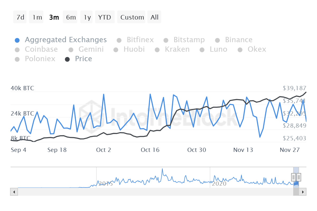 Further, the Awesome Oscillator (AO) is in the positive territory, with green histogram bars, suggesting the bulls are leading the market. Increased buying pressure, therefore, could see Bitcoin price extend from the current price of $39,462 (as of 8:00 AM GMT), and clear the $39,778 range high before scrapping the $40,000 psychological level.