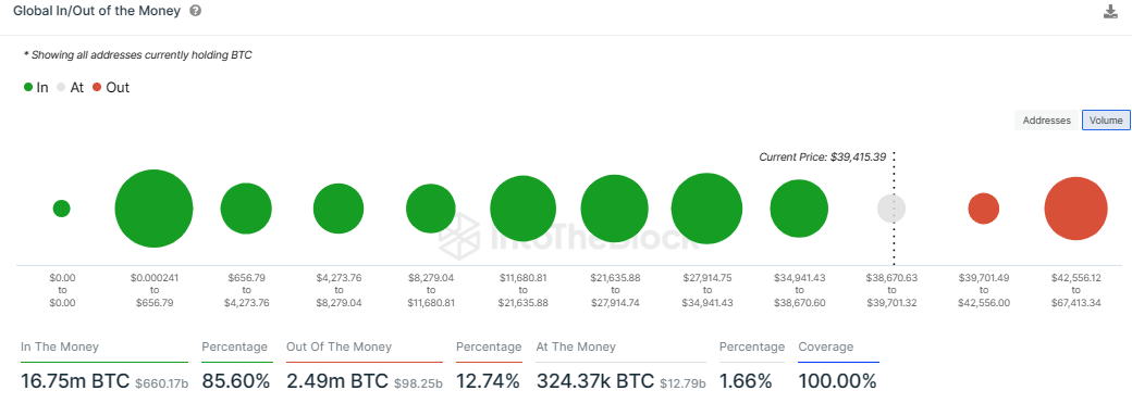 On-chain aggregator IntoTheBlock’s Global In/Out of the Money (GIOM) metric shows there is no supply barrier that will prevent the largest crypto by market cap from achieving its upside potential. Based on this on-chain metric, there is only one major area of interest between $38,670 and $39,701 that is filled by a high number of investors that had previously purchased BTC around this price level. Here, roughly 860,540 addresses are holding nearly 324,370 BTC tokens.