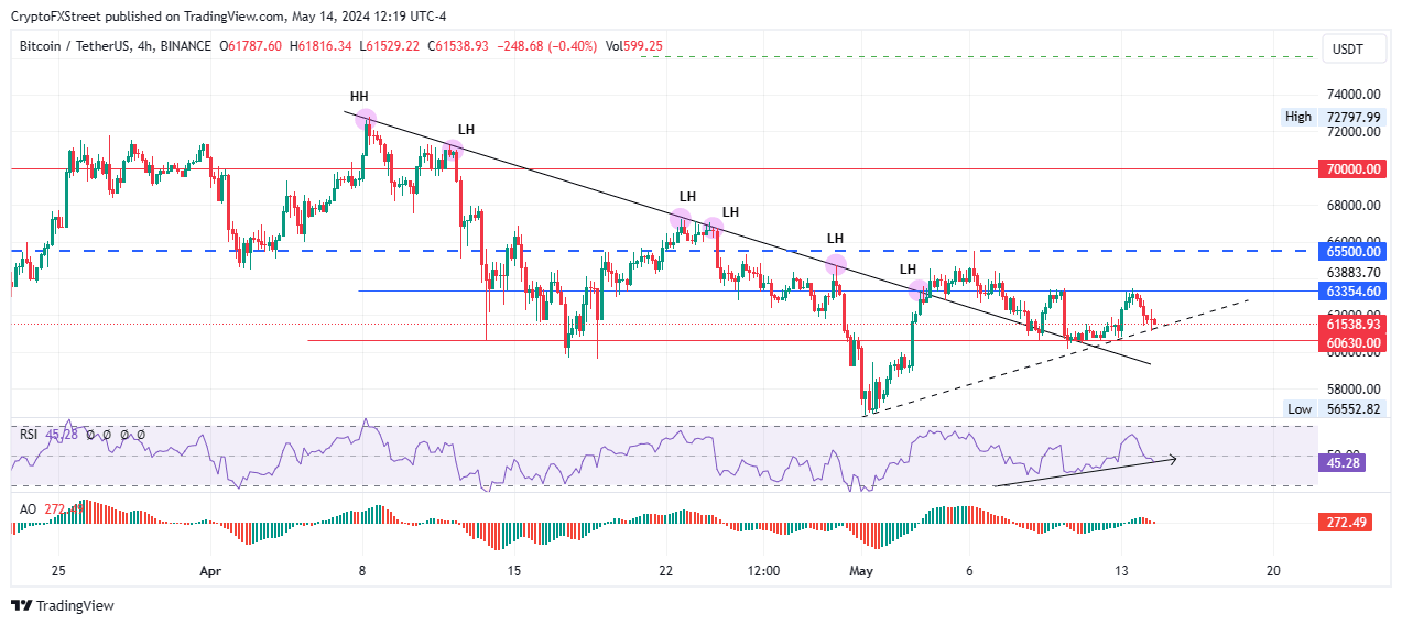 Bitcoin price is primed for a bounce as it defends against further downside, shown by the Relative Strength Index (RSI), which is deviating horizontally. If this momentum indicator defends against a lower high, Bitcoin price could bounce atop the ascending trendline, potentially recapturing the $63,354 threshold.