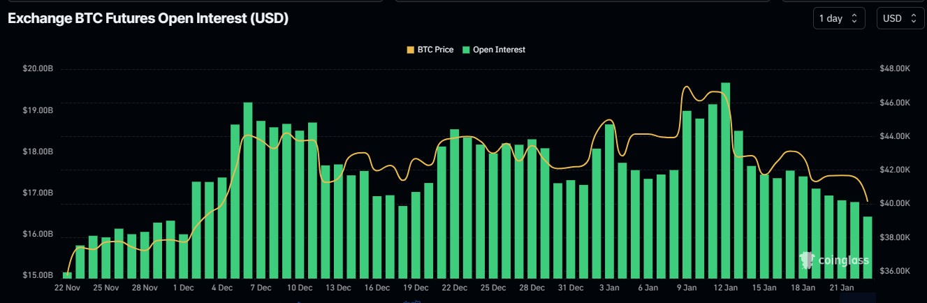 The slump also saw up to $400 million in open interest wiped out of the market, moving from $16.83 billion to $16.43 billion between January 21 and 22. This represents a 2.4% drop in under 24 hours.