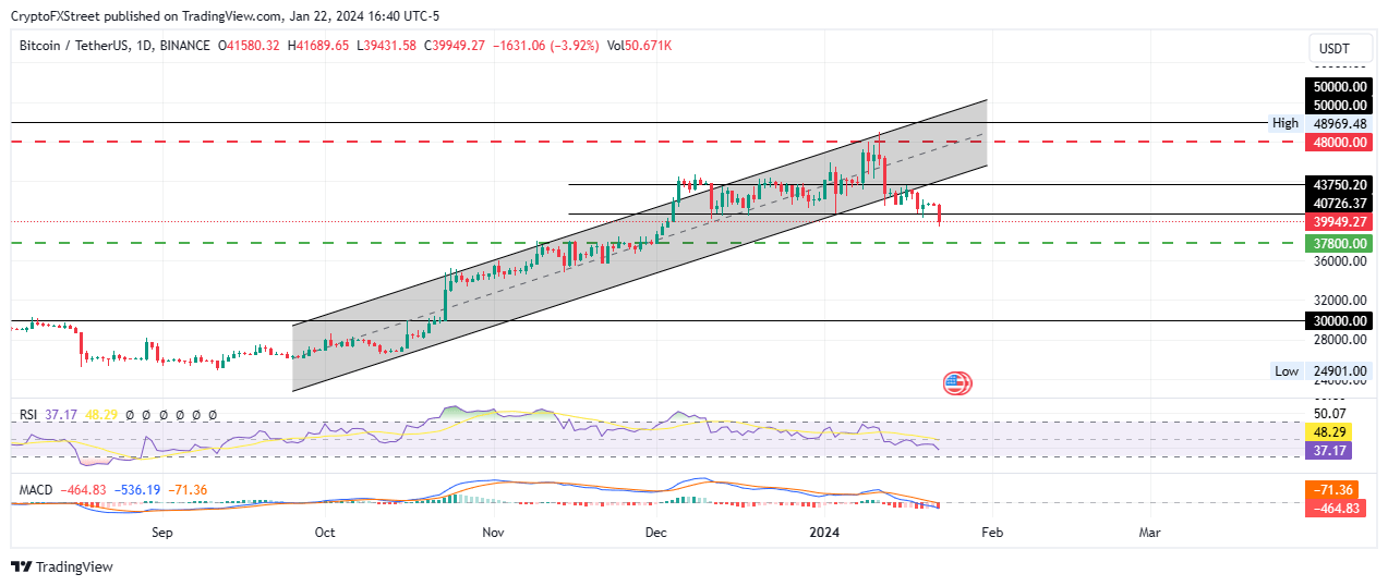 At the time of writing, Bitcoin price is trading for $39,949, with the Relative Strength Index (RSI) nose-diving to show falling momentum. The odds continue to favor the downside, with the Moving Average Convergence Divergence (MACD) indicator moving below the signal line after a bearish crossover.