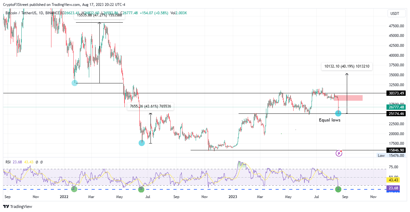 At the time of writing, Bitcoin price is $26,777 following the retraction, representing a 7% pullback from the intra-day low of $25,166. The pullback seems to have given retail traders a chance to step in after being sidelined. The Relative Strength Index (RSI) moving north points to rising momentum, possibly because of FOMO (fear of missing out), and could see the market change direction.