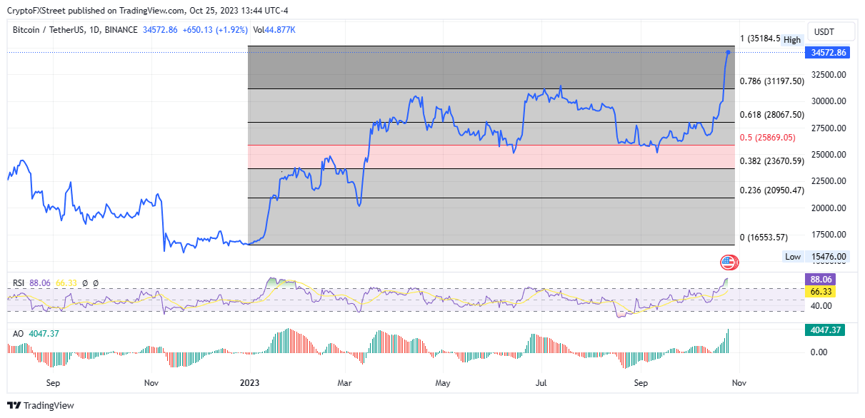 Bitcoin price is $34,572 at the time of writing, with the potential to soar higher as momentum remains strong. It holds above the market’s midrange, measured from the yearly low to the yearly high of $35,184.