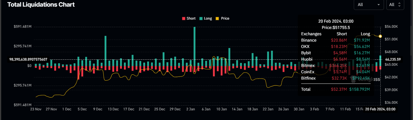 Bitcoin (BTC) price slipped almost 1.30% on Tuesday, liquidating $158.79 million in long positions against $52.37 million in short positions.