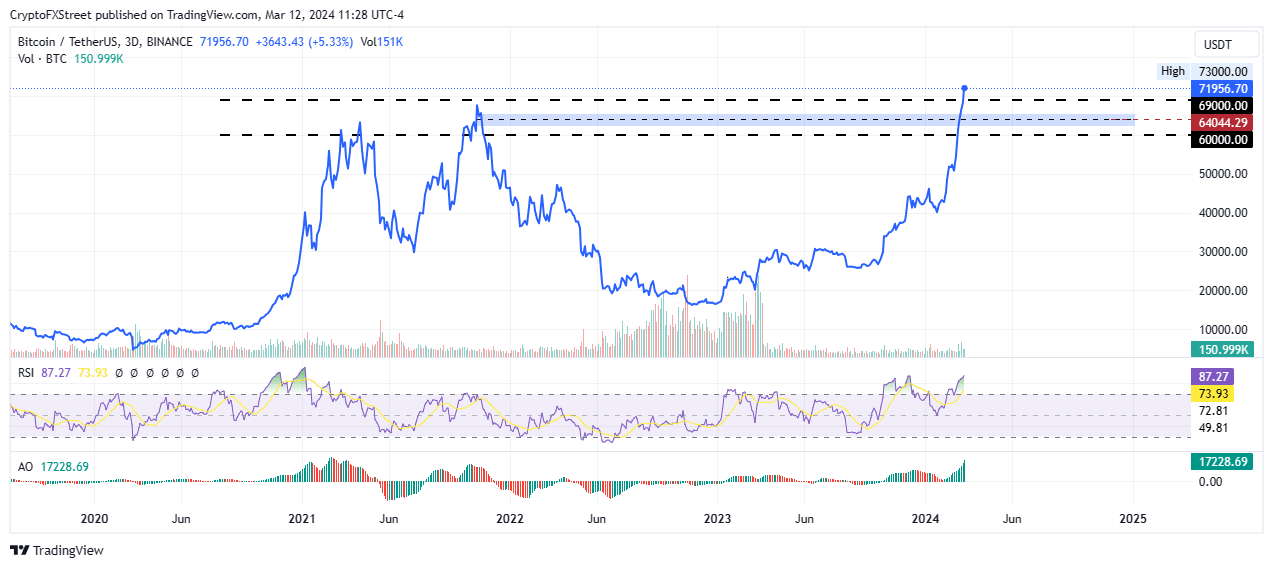 Bitcoin price remains well above the 2021 peak of $69,000, with the bulls not showing any signs of stopping. Trading above the $70,000 threshold, BTC could make a 12% climb to the $80,000 psychological level as buying pressure continues to increase.