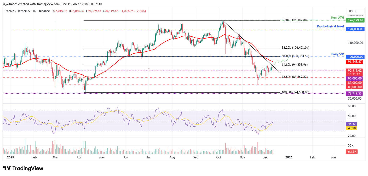 Bitcoin price was rejected at the 61.8% Fibonacci retracement level at $94,253 (drawn from the April low of $74,508 to the all-time high of $126,199 set in October) on Wednesday and declined slightly that day. At the time of writing on Thursday, it continues to trade down at around $90,300.