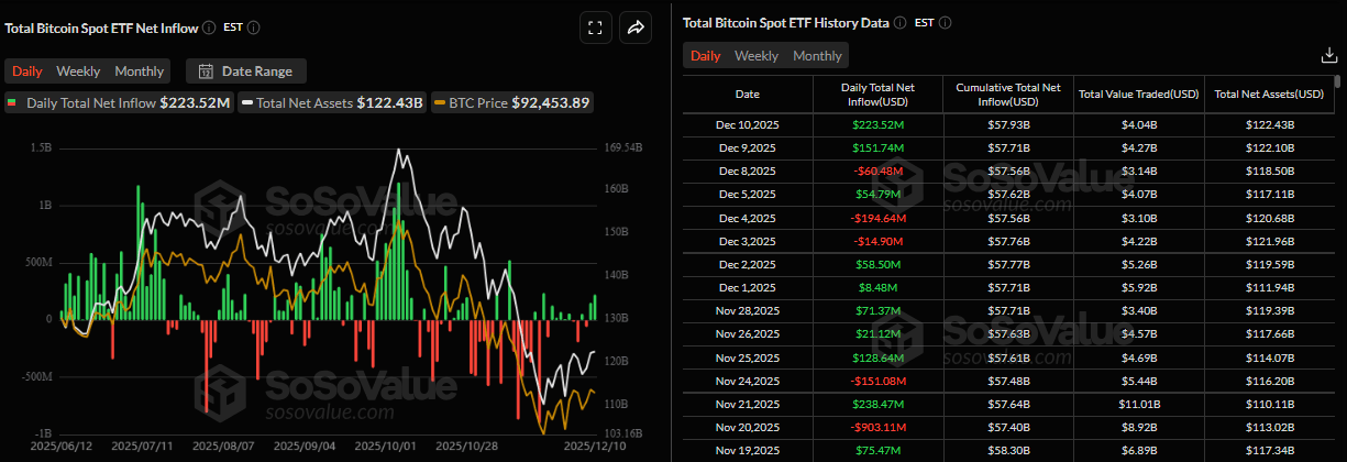Institutional demand for Bitcoin shows a slight improvement. According to SoSoValue data, US-listed spot Bitcoin ETFs recorded $223.52 in inflows on Wednesday, the second consecutive day of inflows this week. For BTC to continue its recovery, the ETF inflows should intensify.