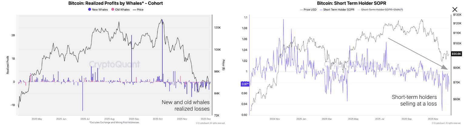 Moreover, downward pressure on Bitcoin’s price eased as large investors and short-term holders continued to realize losses. The chart below shows that on November 13, new and old whales realized the largest losses since July, $646 million, as prices first crossed below $100,000. Since then, these large investors have realized a total net loss of $3.2 billion. Meanwhile, short-term holders have been selling Bitcoin at a negative profit margin since mid-November (SOPR below 1), with the lowest reaching -7%. Historically, selling pressure eases when market participants realize they have incurred heavy losses.