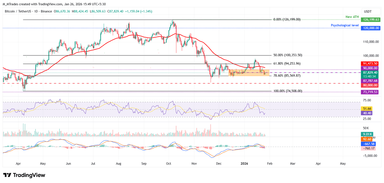 If BTC fails to close above the $87,787, it could extend the fall toward the lower consolidation boundary at $85,569, which coincides with the 78.6% Fibonacci retracement level.